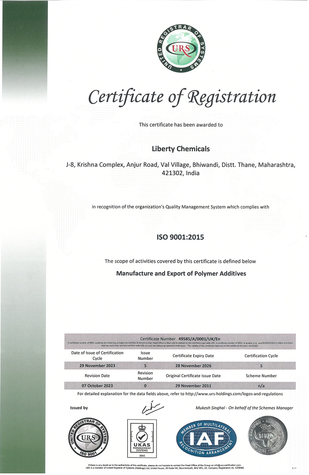 Constantly marching towards success, the liberty chemicals - an ISO 9001:2015 Certified Company, is a